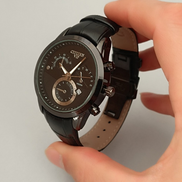 ساعت مچی مردانه سیتیزن طرح سه موتور با کیفیت ، بند چرمی محکم و ضخیم دارای روزشمار . مناسب برای استفاده روزمره ، استایل اسپورت و کلاسیک. تمامی ساعت های فروشگاه کادویی نوا قبل از ارسال بصورت ظاهری و موتوری چک میشوند.